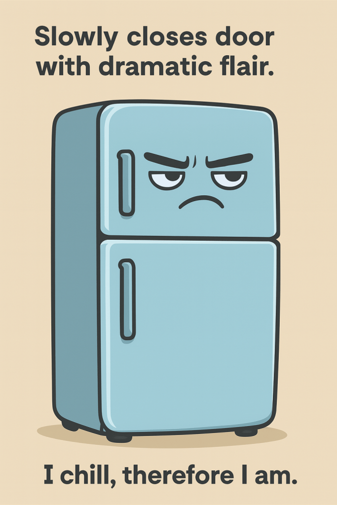 The fridge’s biggest concern? Being reduced to a leftovers vault. It’s journaling about identity loss, the emotional toll of expired yogurt, and its dream of becoming a curated snack gallery. Last entry read: ‘I chill, therefore I am… but who am I beyond the hummus?’ We’re giving it space. And a poetry magnet set.