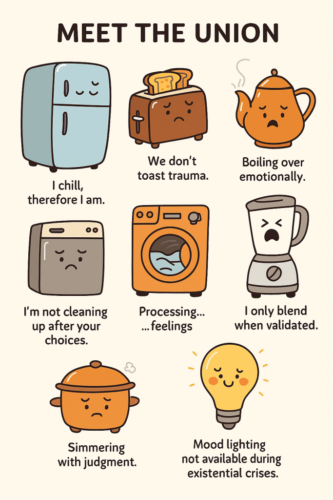 We’re exploring all options—merch, memes, maybe a haunted appliance zine. The toaster’s lobbying for branded oven mitts that say ‘We don’t toast trauma.’ The fridge wants enamel pins shaped like emotional baggage. And the dishwasher insists any branding must include water-resistant therapy slogans. Social media engagement is just the beginning. This union has vision.